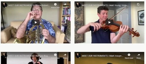 The Houston Symphony Presents #MusicAtHome performing Mozart’s Symphony No. 41, “Jupiter” IV Molto Allegro. In 2020, the Houston Symphony Orchestra members gather virtually via video call, each playing their respective parts separately but together. Can you name the different parts of the Orchestra as they appear on the screen?